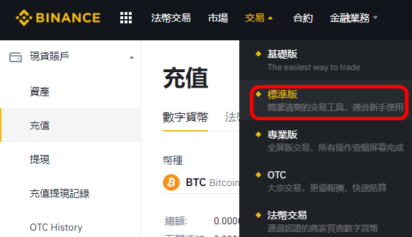 收到加密貨幣後,,要進行交易的話,請從選項“交易”進入“標準版”一項。