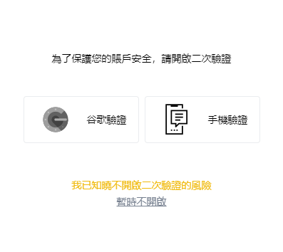 4. 雖然可以省略這一步,但是為了加強安全功能,我推薦開啟二次驗證。您可以在'谷歌驗證'或'手機驗證'中選擇一個,按照提示進行即可。這樣我們就完成了註冊。
