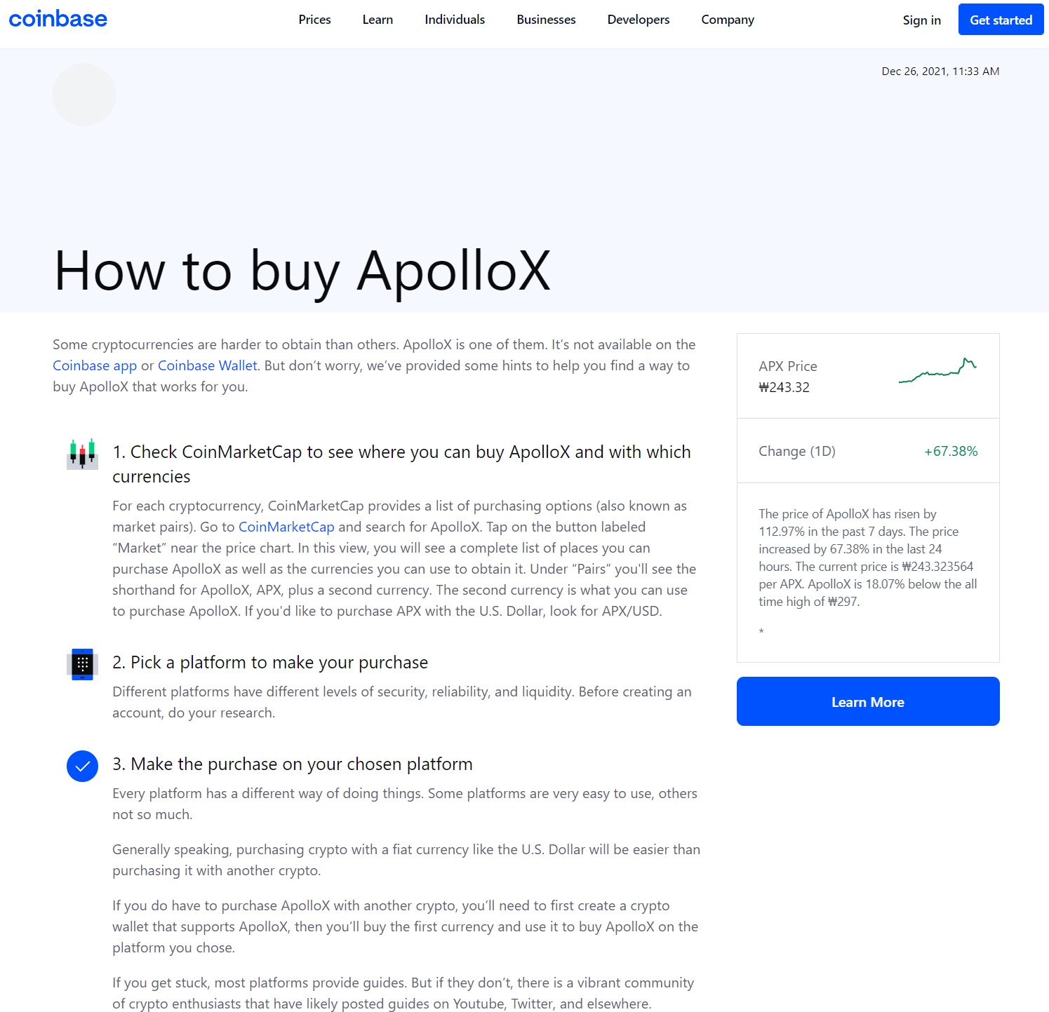 美國最大的交易所 Coinbase 在其網站上介紹瞭如何購買 APX幣,即 Apollo X 交易所平台幣。