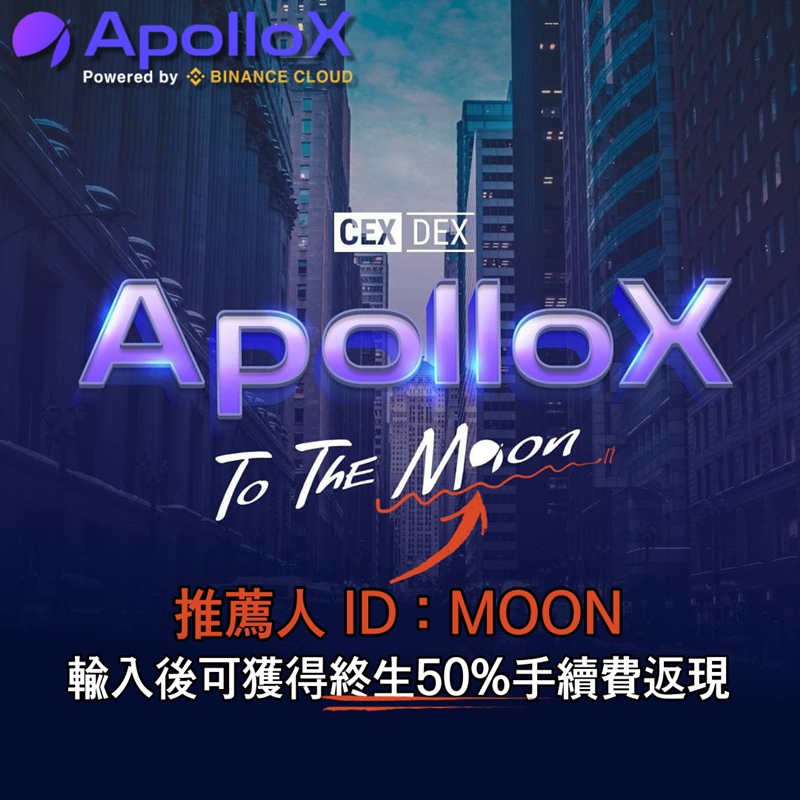 Apollo X既有CEX(中心化交易所)也有DEX(去中心化交易所),如果你在註冊CEX(中心化交易所)時輸入moon作為你的推薦ID,將終身獲得50%的手續費折扣。 (僅限CEX)