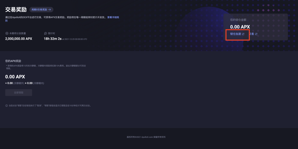 在交易奖励页面,您可以看到“本期待发数量”,“倒计时”,“您的APX奖励”以及您的“锁仓金额”。其中“您的APX奖励”将包括冷静期内与冷静期外的APX。当您有冷静期外的APX后,将会有选项帮助您只领取冷静期外的APX。