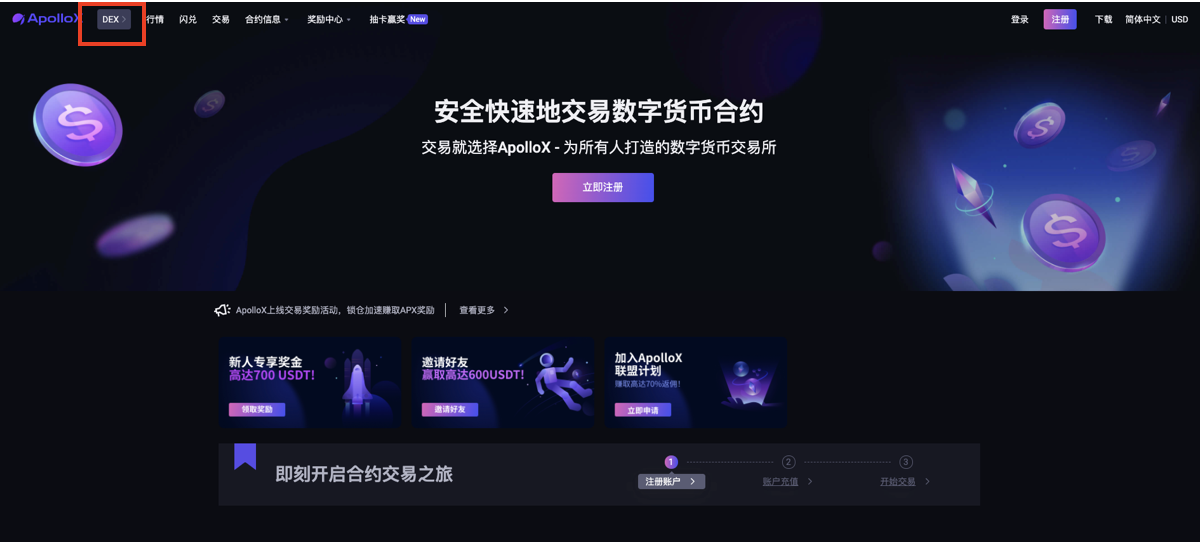 本次挖礦活動就是在dex交易所進行的,註冊返現鏈接如下 https://www.apollox.finance/zh-CN/futures/BTCUSDT?ref=dex