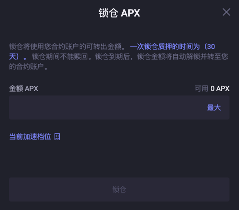 点击锁仓加速进入锁仓页面。点击锁仓,输入APX锁仓金额,提交锁仓即完成。注意,锁仓的APX将会在30天后自动解锁。请注意,您需要将要锁仓的APX从钱包转入至ApolloX去中心化合约账户。