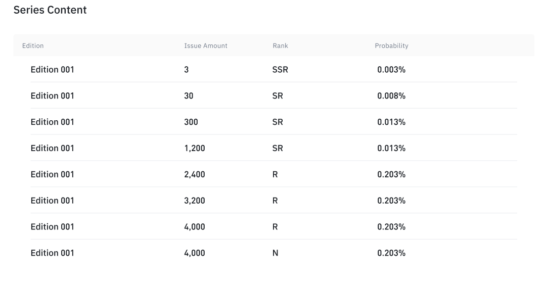 神秘盒包含一個贏得隨機NFT的機會。每個NFT都有不同的稀有等級﹕正常(N)、稀有(R)、超稀有(SR)及超級超級稀有(SSR)。購買神秘盒後,您無需立即打開它。您可以隨時打開它,甚至是不打開它然後把它出售。