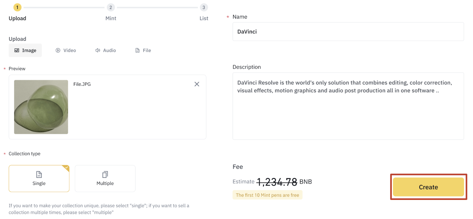 上傳您想轉換為NFT的圖像、影片、音頻或文件後,填寫相關的非同質化代幣詳細資訊。這些訊息包括是要鑄造單一NFT或是一整個系列的NFT。確保您有足夠的BNB以支付鑄造費,然後點擊 [Create]。