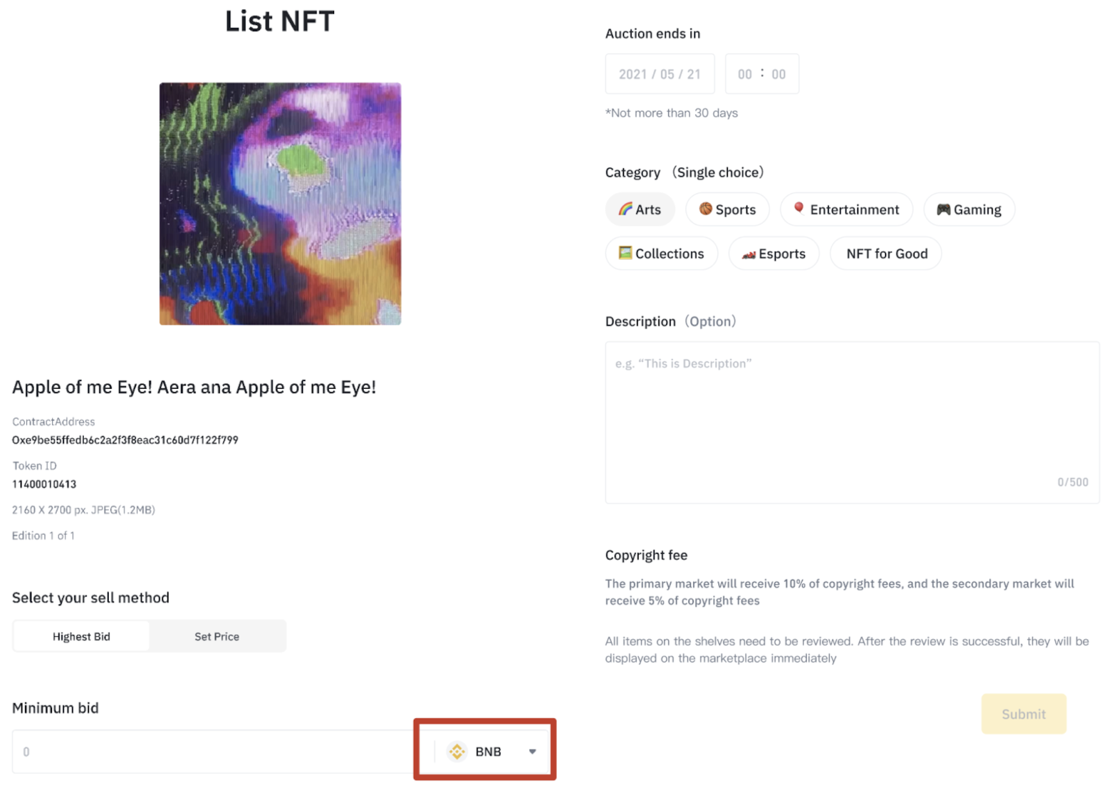 您也要設定銷售結束的日期,從上市之日起不超過30天。準確地輸入關於NFT的資訊,包括好處、特點或實用程序。仔細考慮其類別,它有助買家更容易找到您的NFT。