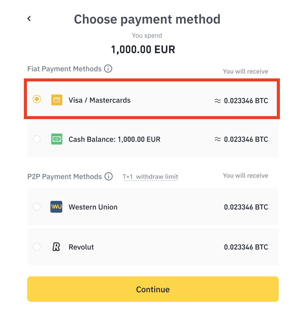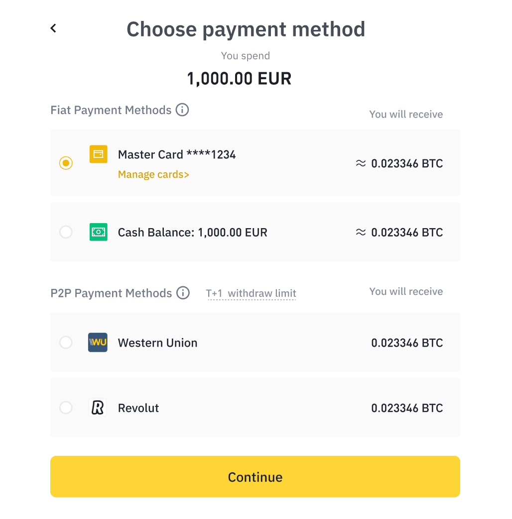 2. 您可以選擇使用不同法幣購買加密貨幣。輸入法幣金額,系統將自動顯示您可以購得的加密貨幣金額。點擊 【繼續】。
