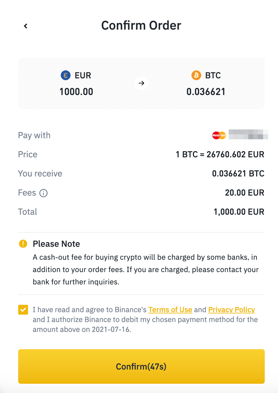 6. 請檢查支付詳情和手續費並在 1 分鐘內確認您的訂單,否則您可獲得的加密貨幣金額將會依據目前的市場價格重新計算。您可以點擊【刷新】查看最新的訂單金額。