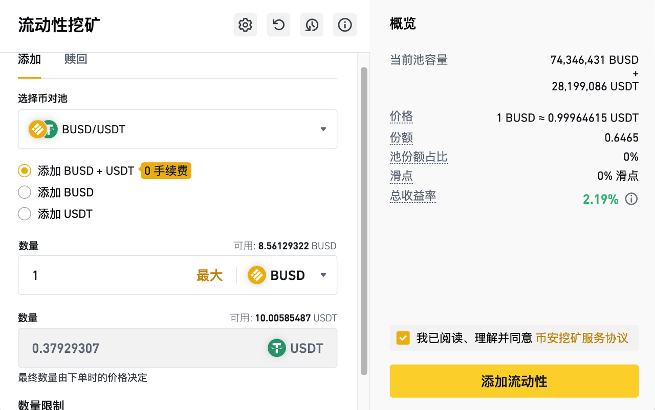 您可以為流動性池添加流動性,成為流動性提供者,獲得手續費收益以及BNB獎勵。