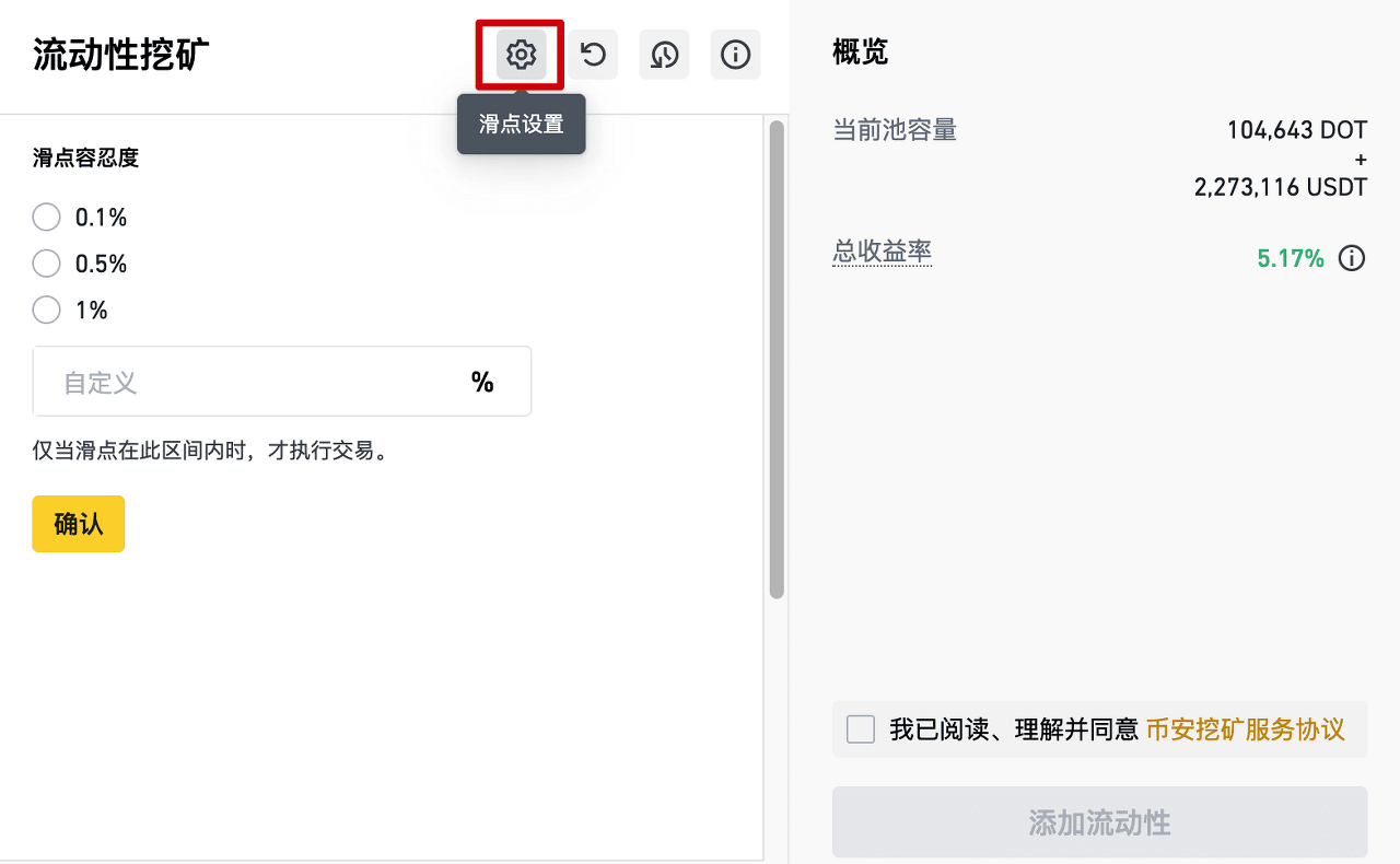 您可以在【流動性挖礦】頁面設置交易滑點的容忍度,僅當滑點在設定區間內時,才能進行交易。