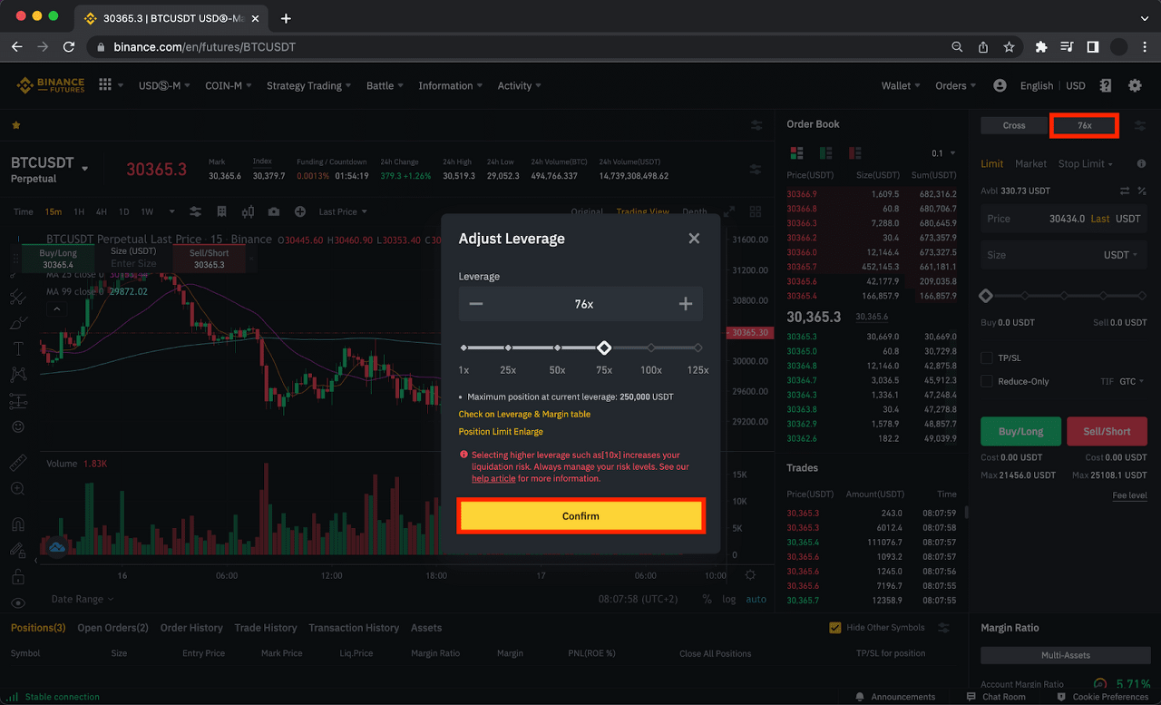 接著,您必須 [調整槓桿] 並點擊 [確認]。