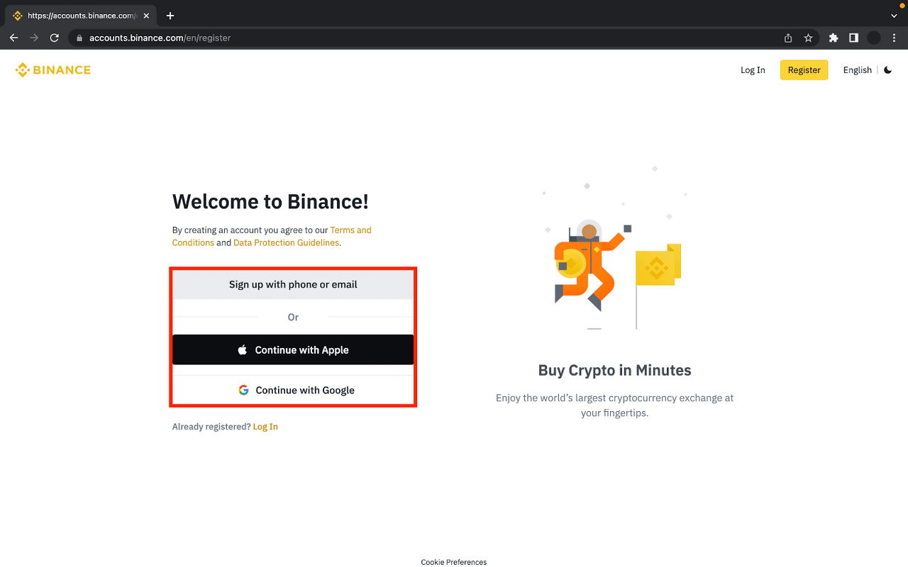 如果您還沒有帳戶,請前往幣安,然後按下頁面右上角的 [註冊]。