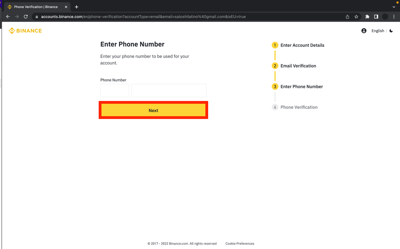 輸入您的 [電話號碼],然後點擊 [下一步]。系統將要求您輸入 [電話驗證碼],然後點擊 [提交] 以創建您的幣安帳戶。