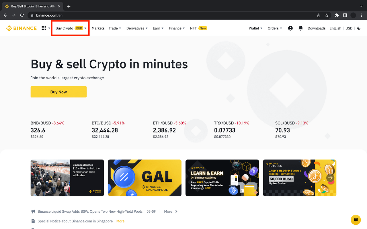 要充值法幣,請前往幣安,然後按下頁面左上角的 [購買加密貨幣]。