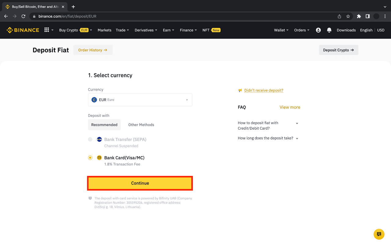 選擇 [幣種]與您希望如何進行首次充值的方法,點擊 [繼續],然後按照說明進行操作。