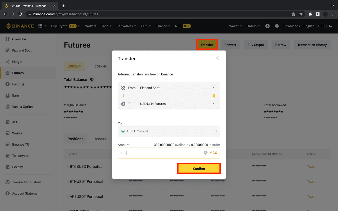 點擊 [轉帳],選擇 [代幣],輸入您要轉帳到幣安合約錢包的 [金額],然後點擊 [確認]。