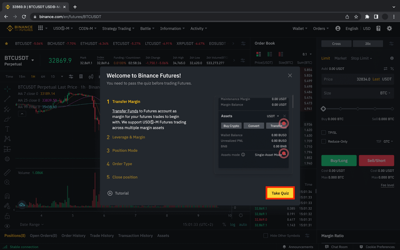 您需要通過測驗才能啟動您的幣安合約帳戶,因此請點擊 [參加測驗] 並正確回答所有問題。