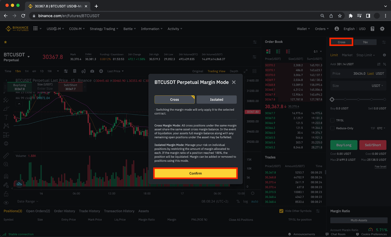 選擇 [保證金模式],該模式僅適用於選定的期貨合約,選擇 [全倉] 或 [逐倉],然後點擊 [確認]。