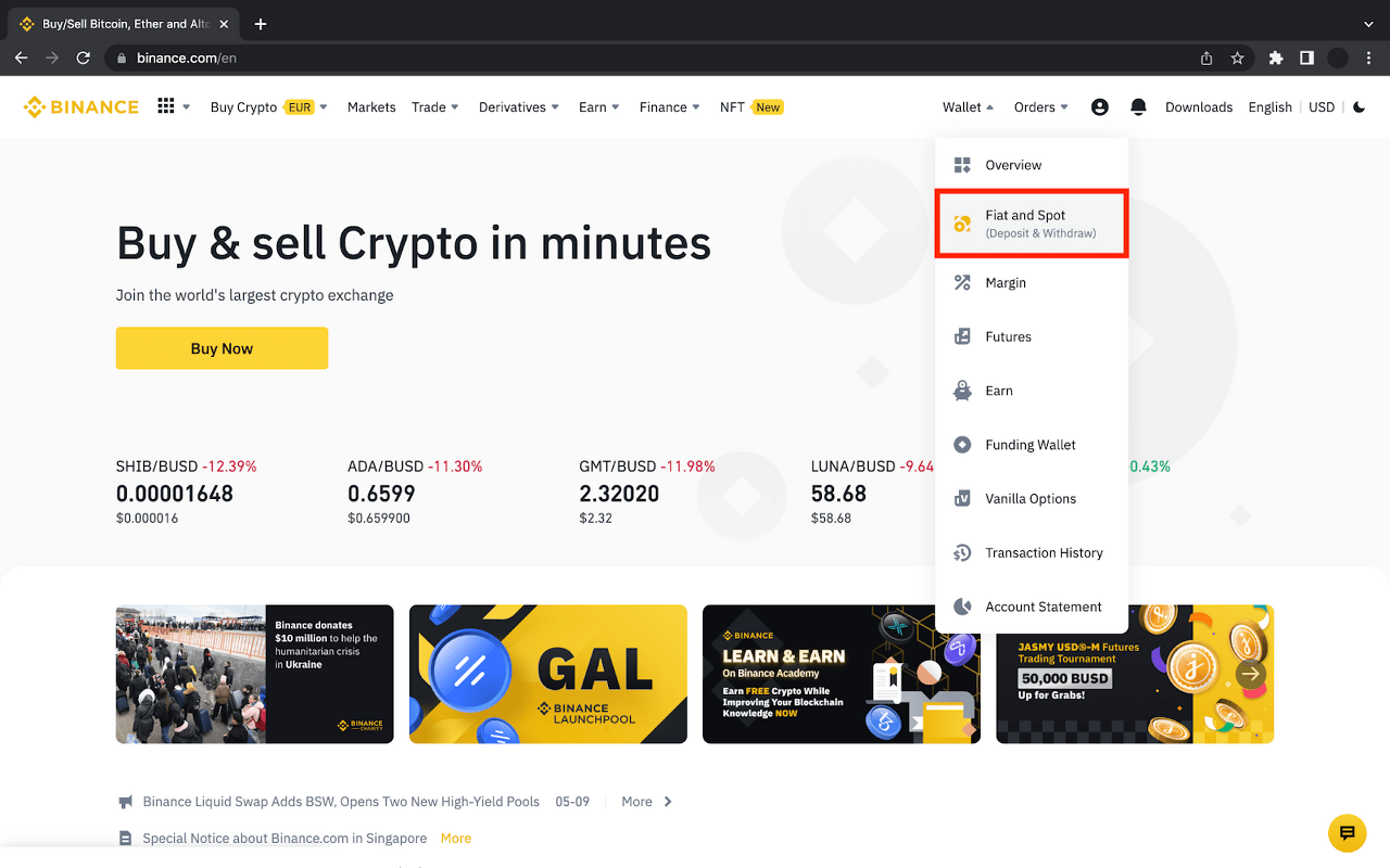 要充值加密貨幣,請前往幣安並點擊頁面右上方的 [錢包] - [法幣與現貨]。