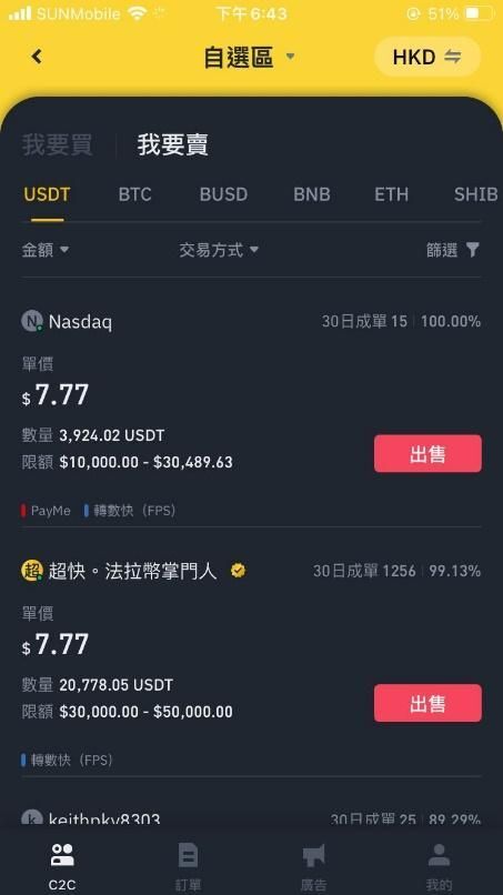 第二步在右上角選擇HKD(港幣),然後選擇「我要賣」及「USDT」。用戶同樣可以按匯率、交易限額、入金方式及過去成功數目選擇收購USDT的商家,目前商家大多支援現金面交、轉數快及Payme交易,選定了心儀商家後便按「出售」。