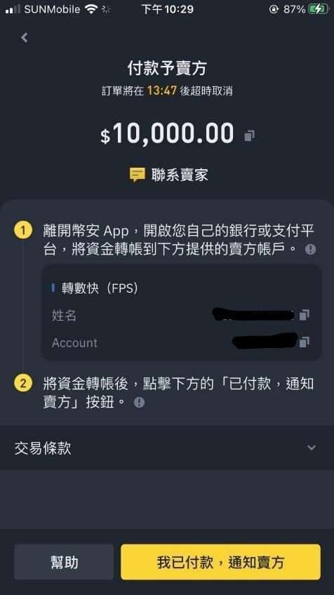 複製商家的轉數快號碼後,便可在流動銀行經轉數快轉帳至商家帳戶。完成轉帳後,點擊下方「已付款,通知賣方」,賣家便會在3分鐘內將USDT轉入買家幣安帳戶。