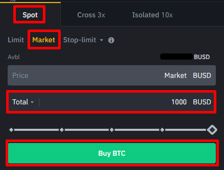 我們以最簡單直接的現貨交易為例:市價單。在我們的範例中,您想購買價值 1,000 BUSD 的比特幣 (BTC)。要完成此操作,您只需在 [總額] 欄位中輸入 1,000,然後按一下 [買入比特幣]。交易所會立即將 BUSD 交割給賣家,您將收到價值 1,000 (BUSD) 的比特幣。