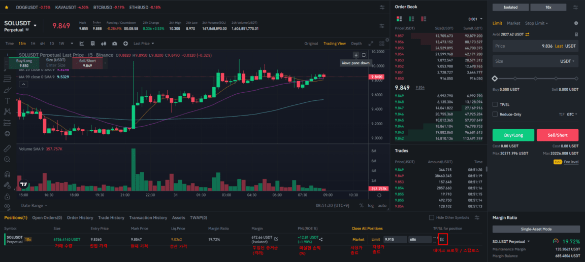 在隔离模式下,假设币主使用Solana(SOL)币建立了多头头寸,10倍杠杆,691 USDT保证金。