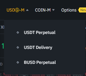 在图片中,USD-M菜单上显示了USDT Perpetual、USDT Delivery、BUSD Perpetual。