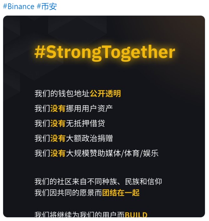 「我們的社群來自不同的種族、民族和信仰;我們將繼續為我們的用戶建設並捍衛這個行業。我們與其他人不同。我們是幣安。」