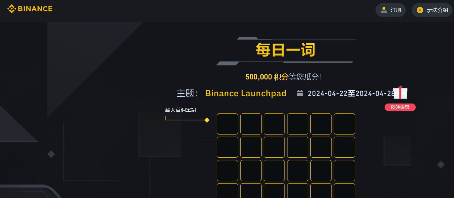币安推出新一轮WOTD趣味猜字游戏。所有符合资格的用户将平分500,000币安积分池,可用于在奖励中心兑换高达10 USDT代币券及50 USDT手续费返还券。