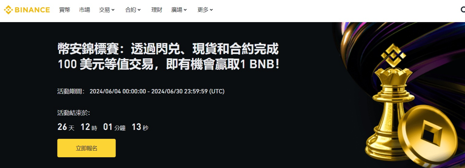 币安为全球加密货币爱好者推出币安世界锦标赛限时活动。用户可通过币安闪兑、现货和合约平台,参与各项赛事,比拼交易技巧,完成至少100 美元等值交易,即有机会赢取1 BNB代币券!