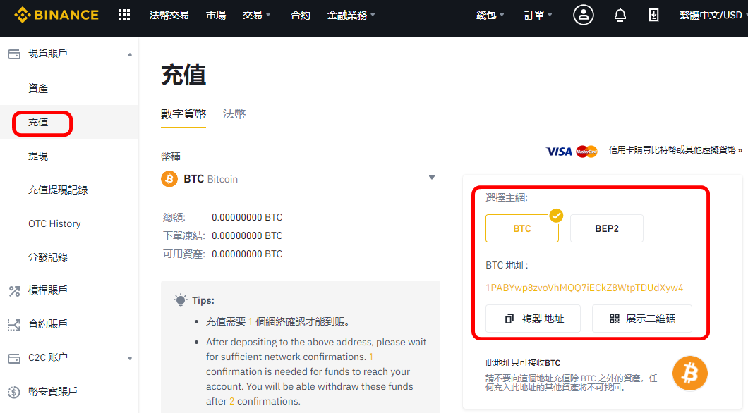 然後在右方紅框內出現的地址裡充值加密貨幣就可以了。