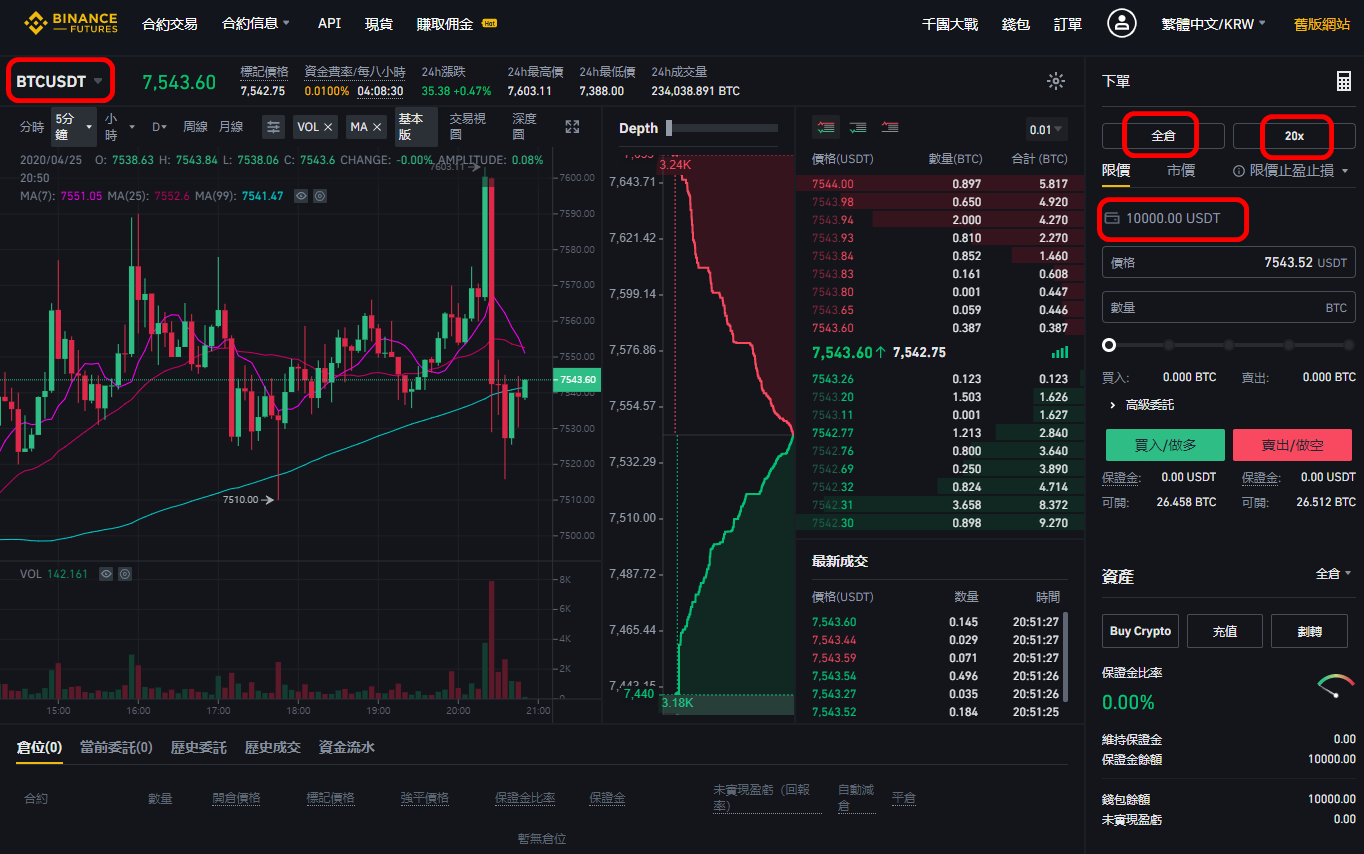 上圖為BTC/USDT交易 可以選擇全倉和逐倉。(上圖為全倉)。 可以調整槓桿 (上圖為20倍)