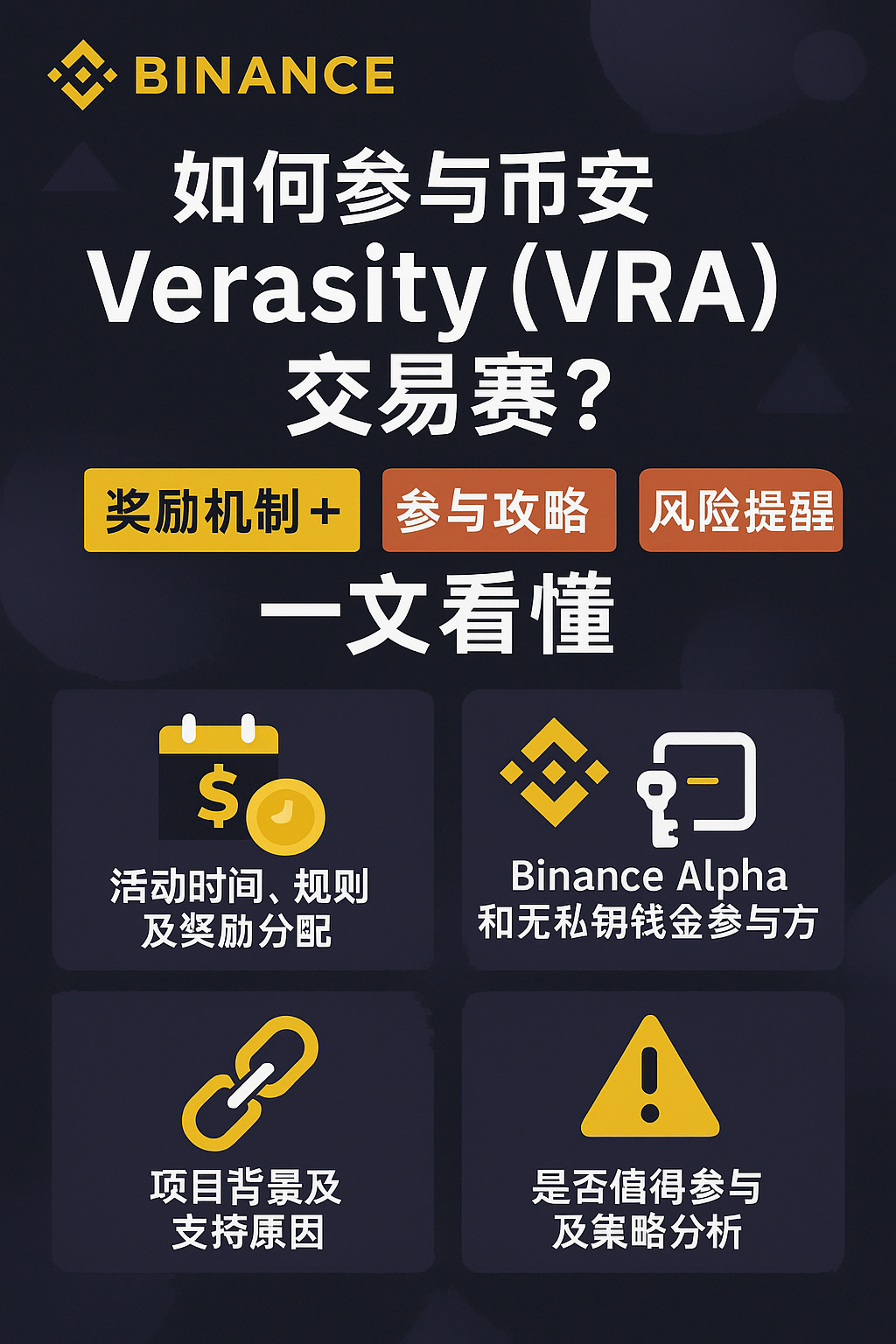 - 活动安排:2025年7月27日07:00(UTC)/15:00(UTC+8)启动,至 8月10日07:00(UTC)/15:00(UTC+8)结束,全程14天,由 Binance Wallet(无私钥)或 Binance Alpha 参与 VRA 交易,排除第三方 dApp 交易渠道