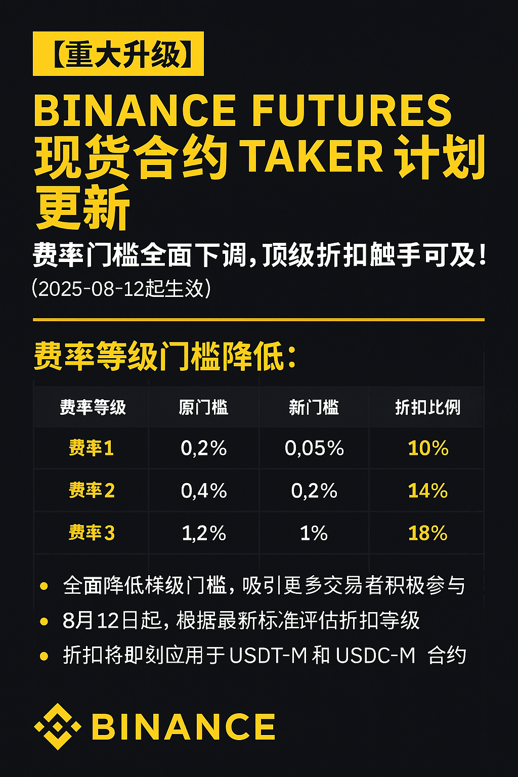 币安(Binance)再次出手优化交易者福利!自2025年8月12日07:00(UTC)起,USDⓈ-M 合约 Taker(吃单)费用折扣计划将迎来全面升级 —— 降门槛、提优惠、抢效率,是高频交易者与专业机构不可错过的新机会!