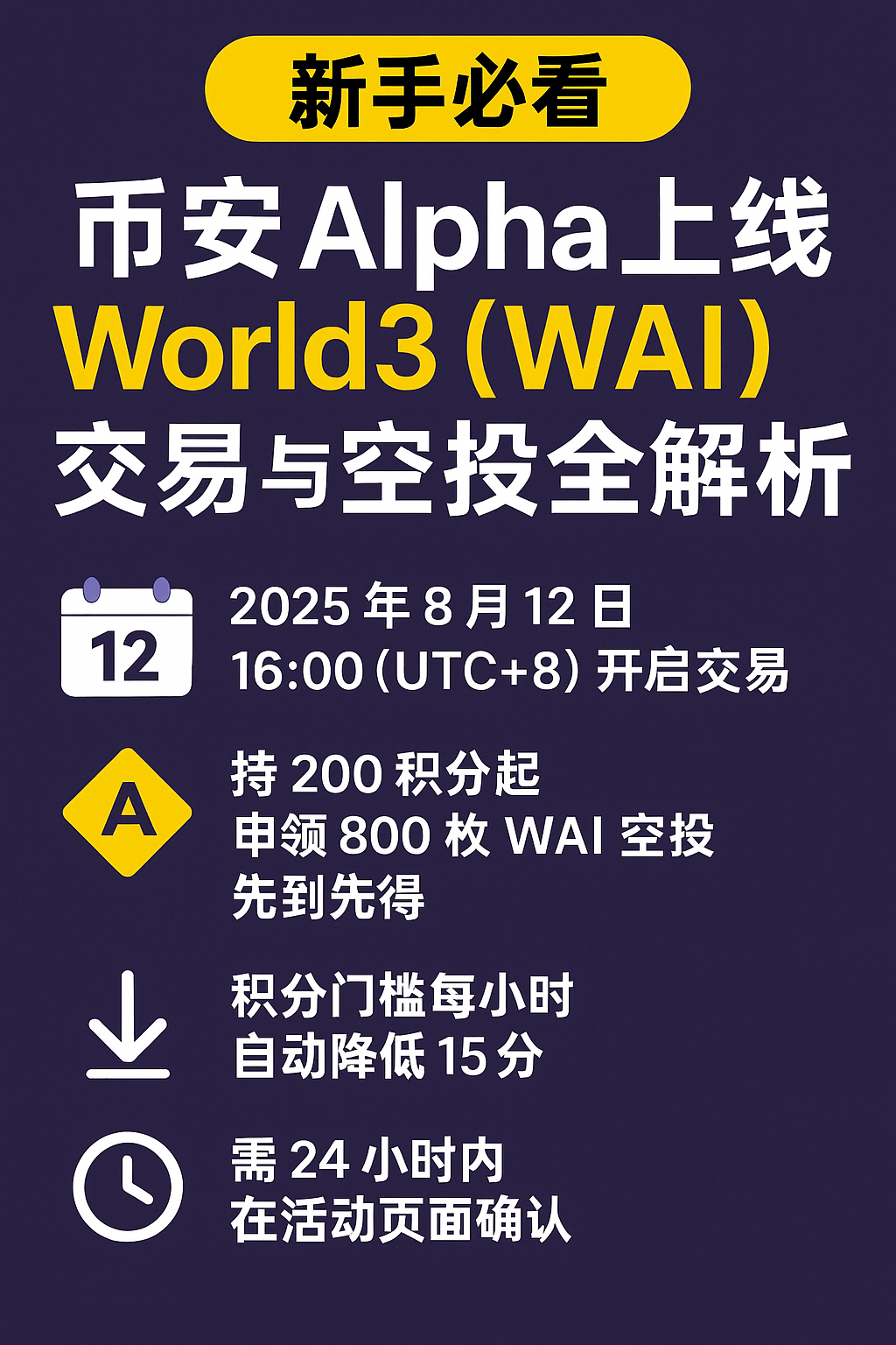 2025 年 8 月 12 日 16:00(UTC+8),币安 Alpha 将正式开启 World3 (WAI) 交易。对于想要参与空投和交易的新手来说,这是一次低门槛、高效率获取新代币的机会,但同时也需要了解完整的规则与注意事项。