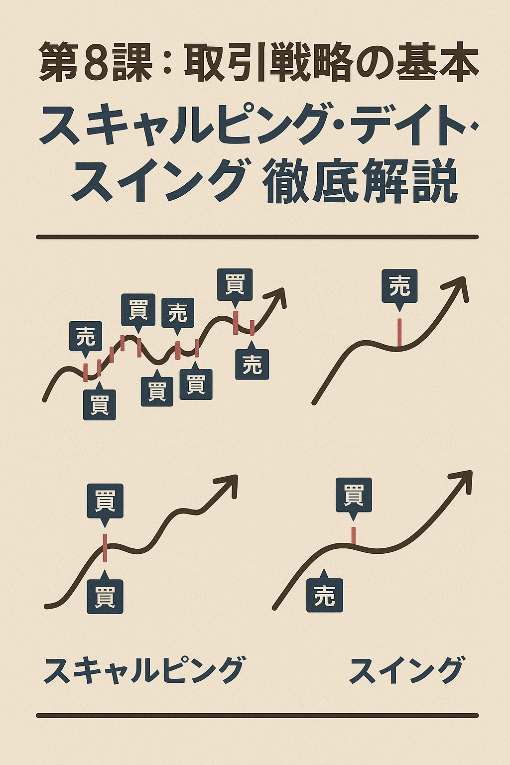 今回は、新手が必ず押さえておきたい 3つの基本取引戦略 —— スキャルピング、デイトレ、スイング —— をわかりやすく比較しながら解説します。