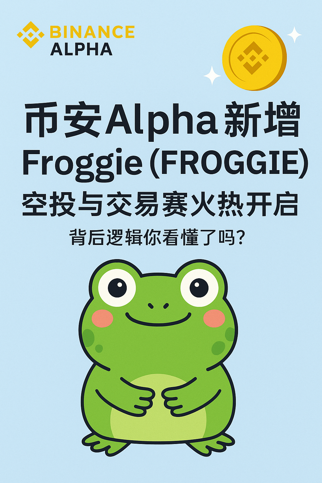 9月20日,全球最大加密资产交易平台**Binance(币安)**宣布,已在其 Alpha 板块上线 Froggie (FROGGIE),并同步启动 基于Alpha Points的空投活动与交易大赛。这背后不仅仅是一次“撸毛”的机会,更透露出币安对早期项目筛选逻辑的信号。