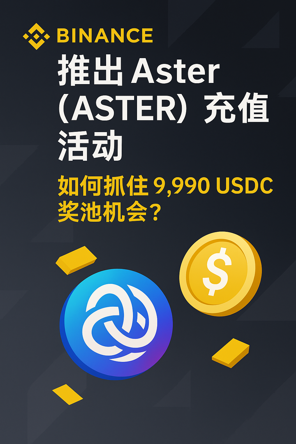 在 2025 年 9 月 29 日 18:00 至 10 月 6 日 18:00(东八区时间),币安 Alpha 将正式上线 Aster(ASTER)充值活动。根据公告,符合条件的用户将有机会瓜分 9,990 USDC 总奖池,其中前 666 名完成指定步骤的用户,每人将直接获得 15 USDC 代币券,先到先得。