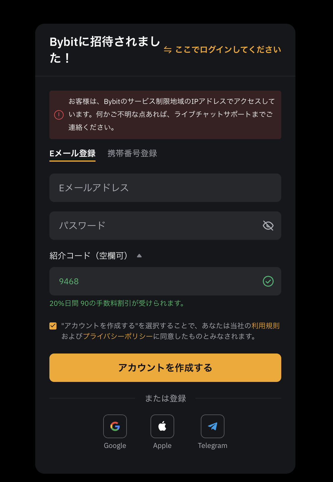 - Bybit アカウントを作成(未登録の方はこちらから登録 👉 招待コード 9468 を入力)