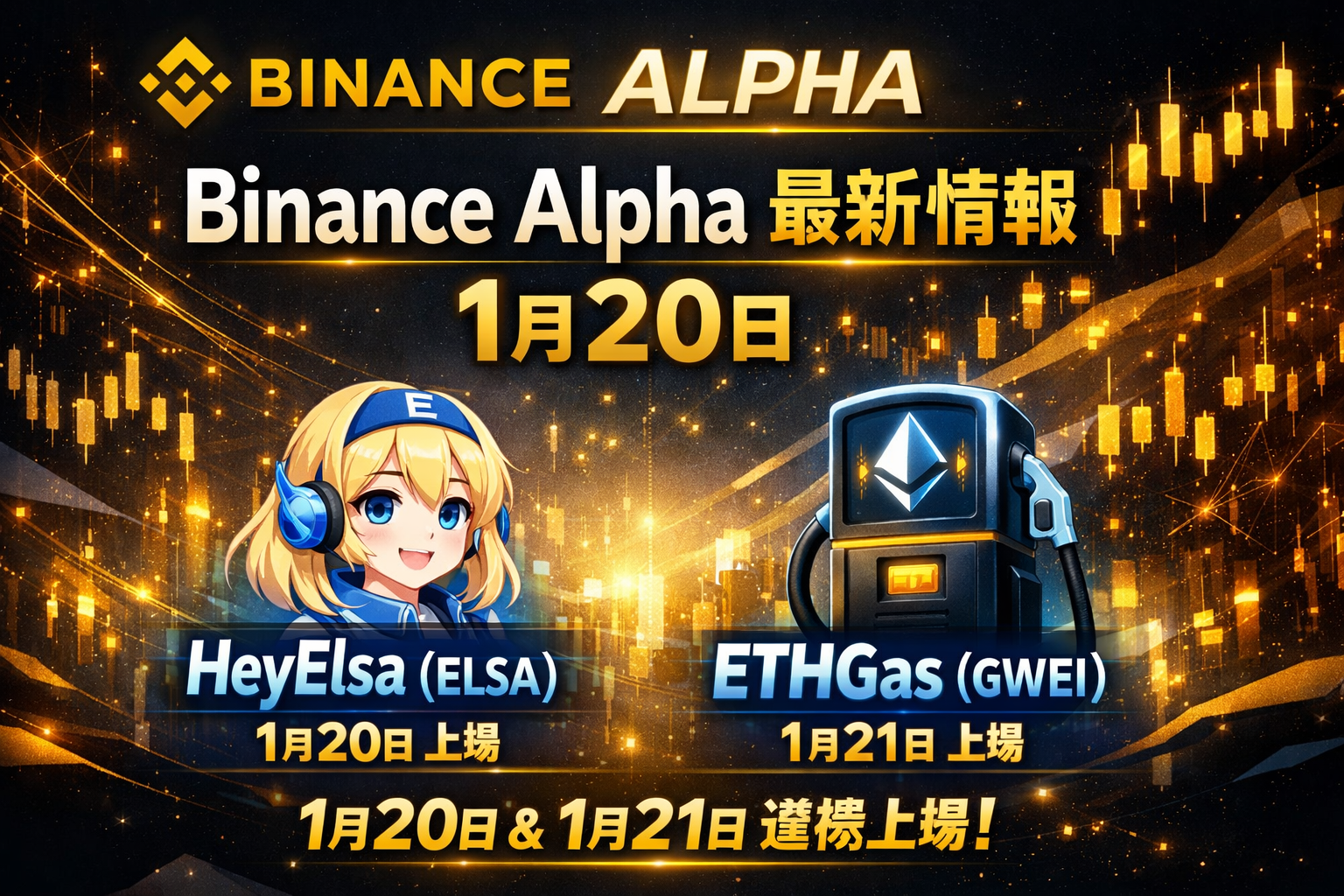 最新情報によると、HeyElsa(ELSA) と ETHGas(GWEI) の2プロジェクトが、1月20日・21日に連続で Binance Alpha に登場します。本記事では、日本ユーザー向けに 日程・ポイント条件・実戦戦略・手数料最適化 を分かりやすく解説します。