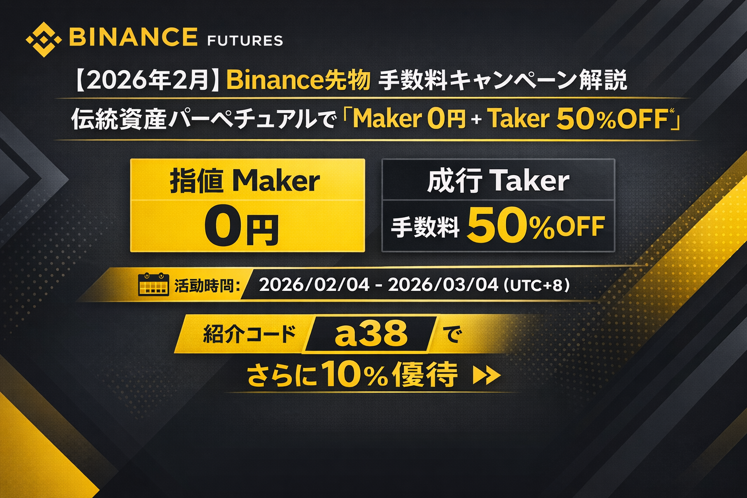 【2026年2月】Binance先物 手数料キャンペーン解説伝統資産パーペチュアルで「Maker 0円+Taker 50%OFF」|紹介コード a38 でさらに10%優待
