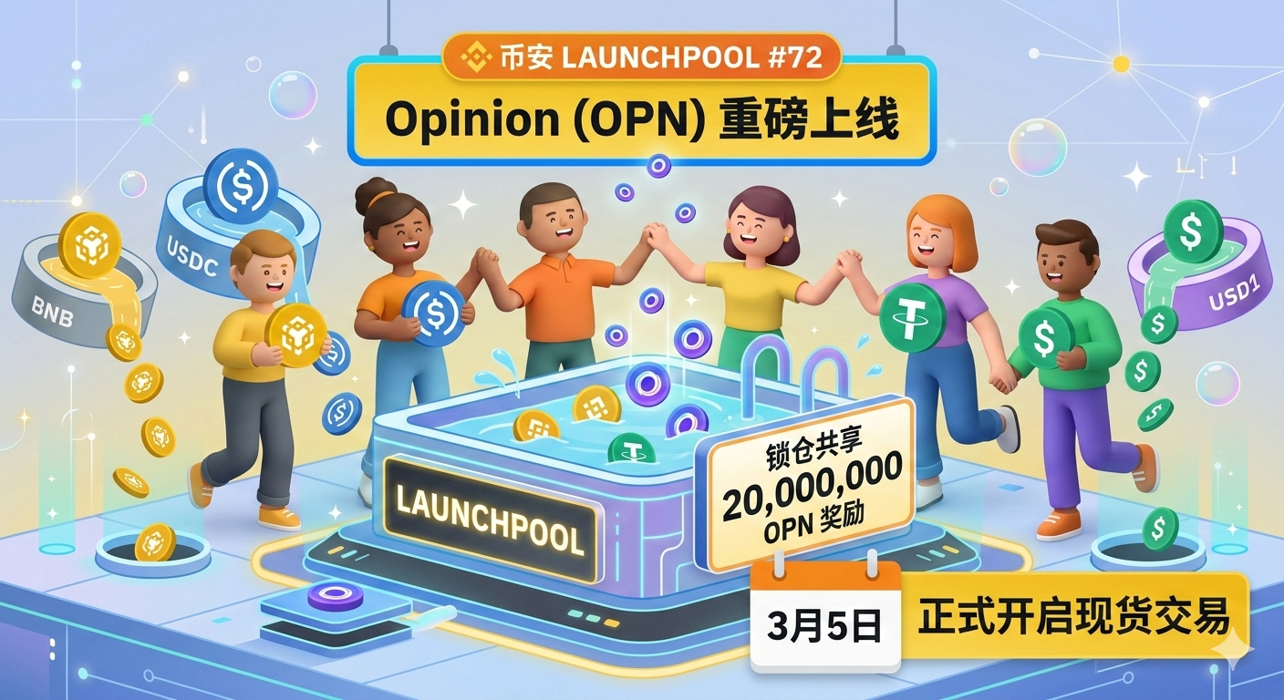 币安正式宣布,Binance Launchpool 第 72 个项目为 Opinion (OPN)。用户可通过锁定 BNB、USDC、U 或 USD1,在两天农场期内瓜分 20,000,000 枚 OPN(占总供应量 2%)。OPN 预计将于 2026 年 3 月 5 日 13:00(UTC) 正式开启现货交易。
