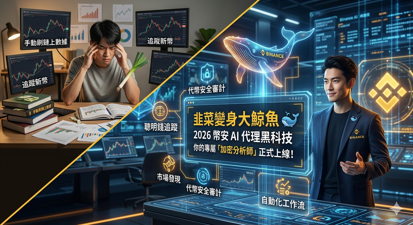 今天,幣安(Binance)釋出了最強大的 AI 代理(AI Agent)技能包。這不是一般的聊天機器人,而是直接串接幣安獨家鏈上數據的「戰鬥外掛」。只要設定好,它就是一個 24 小時不睡覺、幫你掃描金狗(Meme)、審計合約、追蹤巨鯨動向的頂級分析師!