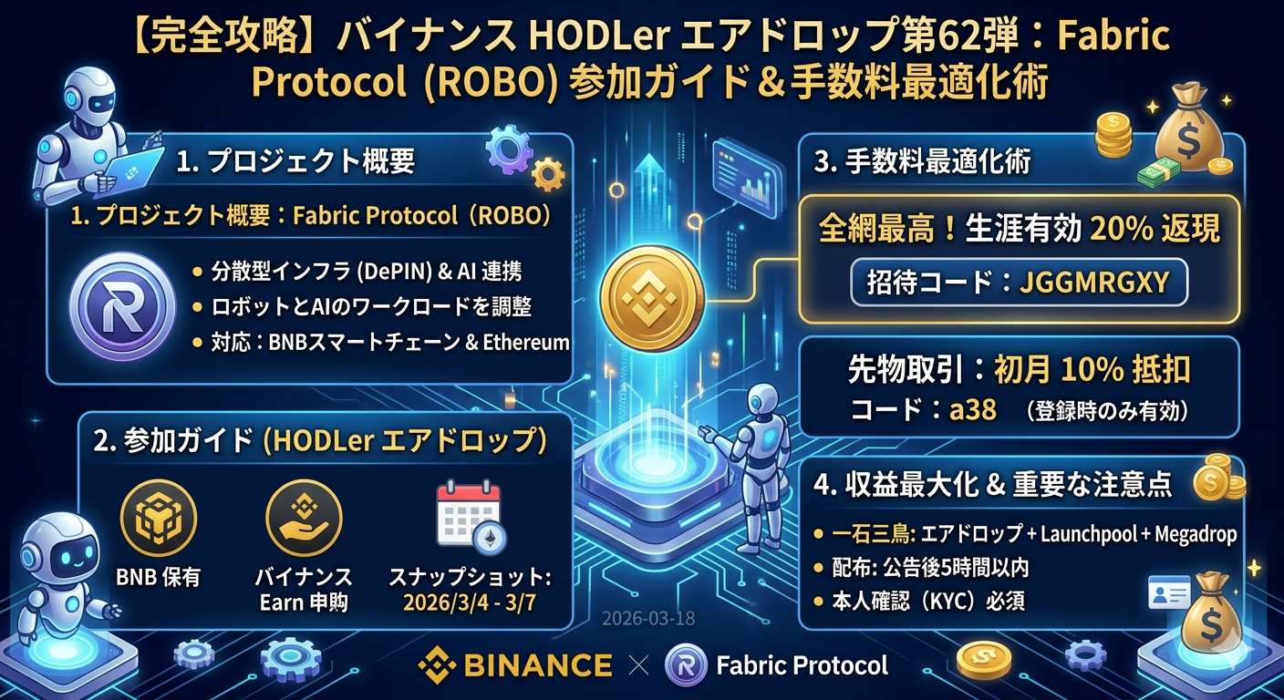 【完全攻略】バイナンス HODLer エアドロップ第62弾:Fabric Protocol (ROBO) 参加ガイド&手数料最適化術