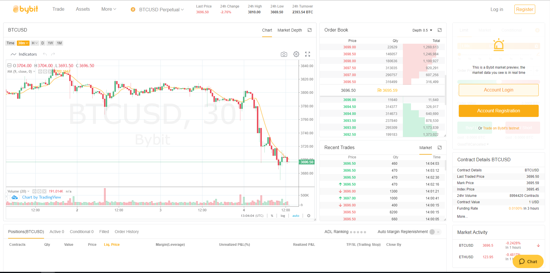 不同的交易所有不同的交易觀點。而且沒有“此概述是最好的”視圖。您應該自己確定哪種交易視圖最適合您。視圖通常具有的共同點是,它們都顯示訂單簿或至少部分訂單簿,所選加密貨幣的價格圖表和訂單歷史記錄。他們通常也有買賣盒。在選擇交易所之前,請嘗試看一下交易視圖,以便確定自己覺得合適。以下是Bybit交易視圖的圖片: